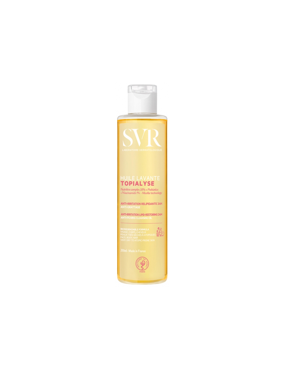 SVR Topialyse Huile Lavante 200 ml est une huile lavante anti-irritation relipidante 24H pour le visage, le corps, les cheveux et les peaux très sèches à atopiques de toute la famille (hors nourrissons prématurés). Sa formule minimaliste et biodégradable associe une très haute concentration en actifs hydratants et relipidants (35%) à la niacinamide apaisante et anti-irritations pour protéger la barrière cutanée et soulager les sensations de démangeaisons. Sa mousse onctueuse ne pique pas les yeux et laisse un parfum délicat. Elle adoucit la peau pour un confort immédiat et longue durée, et préserve l'hydratation pendant 24h.