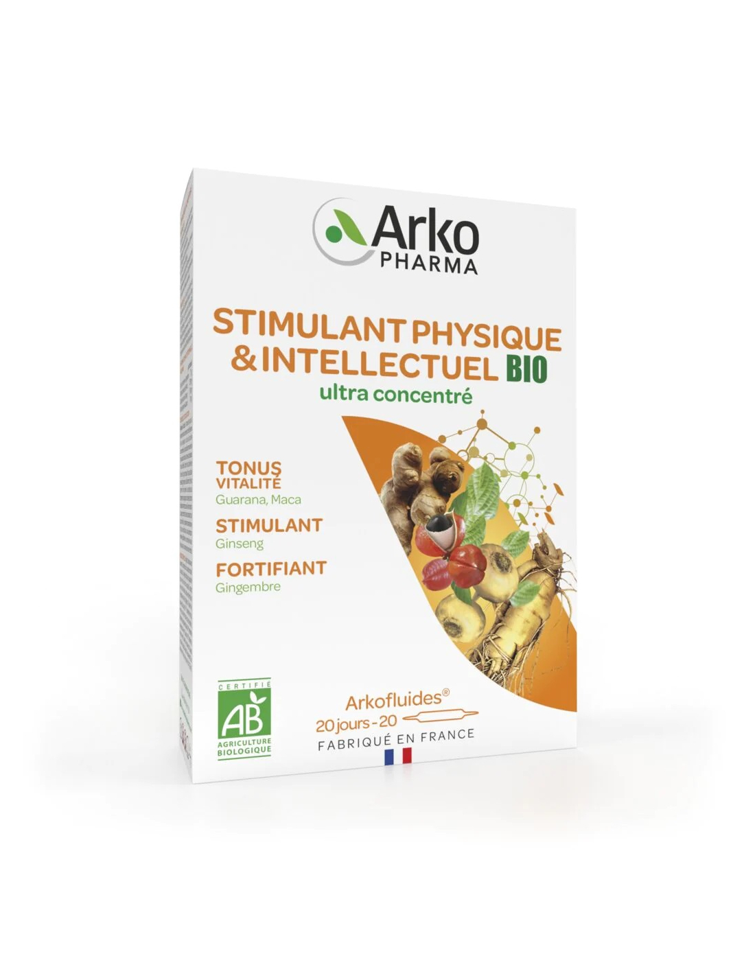 Arkopharma Arkofluides Stimulant Physique et Intellectuel Bio 30 Ampoules Offre Spéciale est un complément alimentaire ultra-concentré indiqué dans les cas de perte de tonus physique et intellectuel. Chaque composant offre chacun ses bienfaits : la racine de Ginseng, appelée "fleur de vie" est connue pour ses propriétés stimulantes physiques et intellectuelles, la Maca aide à stimuler la vigueur physique et à lutter contre la fatigue, le Guarana, aux propriétés toniques, permet d'augmenter la vitalité.