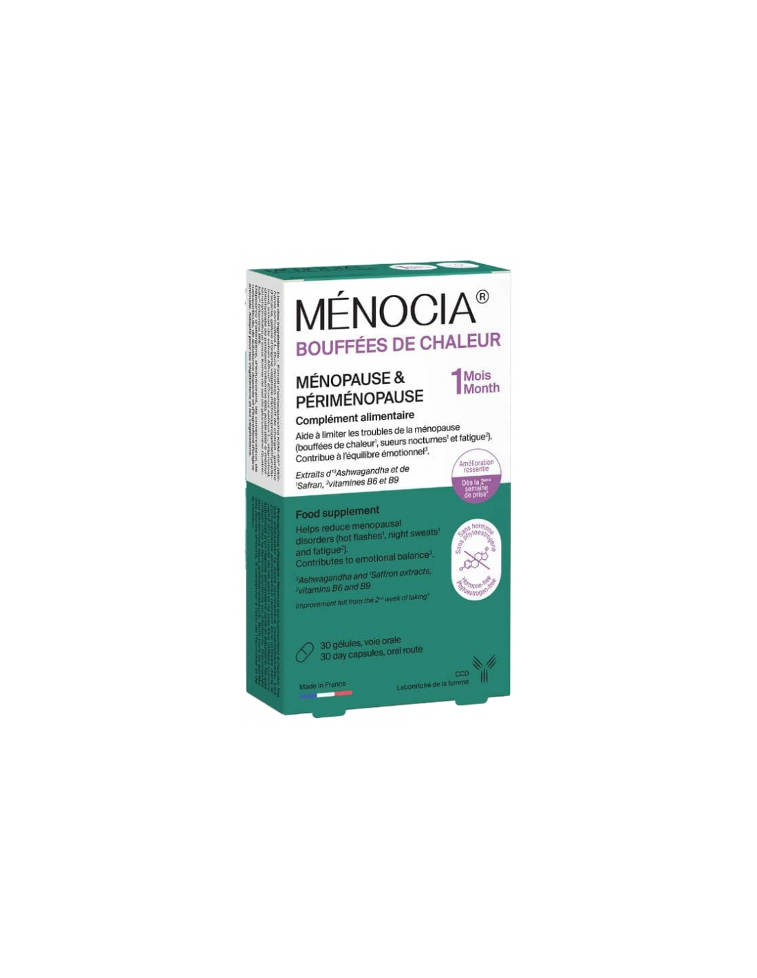 Laboratoire CCD Ménocia Bouffées de Chaleur 30 Gélules est un complémentaire conçu pour accompagner les femmes en période de ménopause et de périménopause. Ce produit est formulé à base d'extraits d'ashwagandha, de safran affron, de vitamines B9 et B6. Il aide à limiter les troubles associés à la ménopause tels que les bouffées de chaleur, les sueurs nocturnes, la fatigue, et contribue à l'équilibre émotionnel.