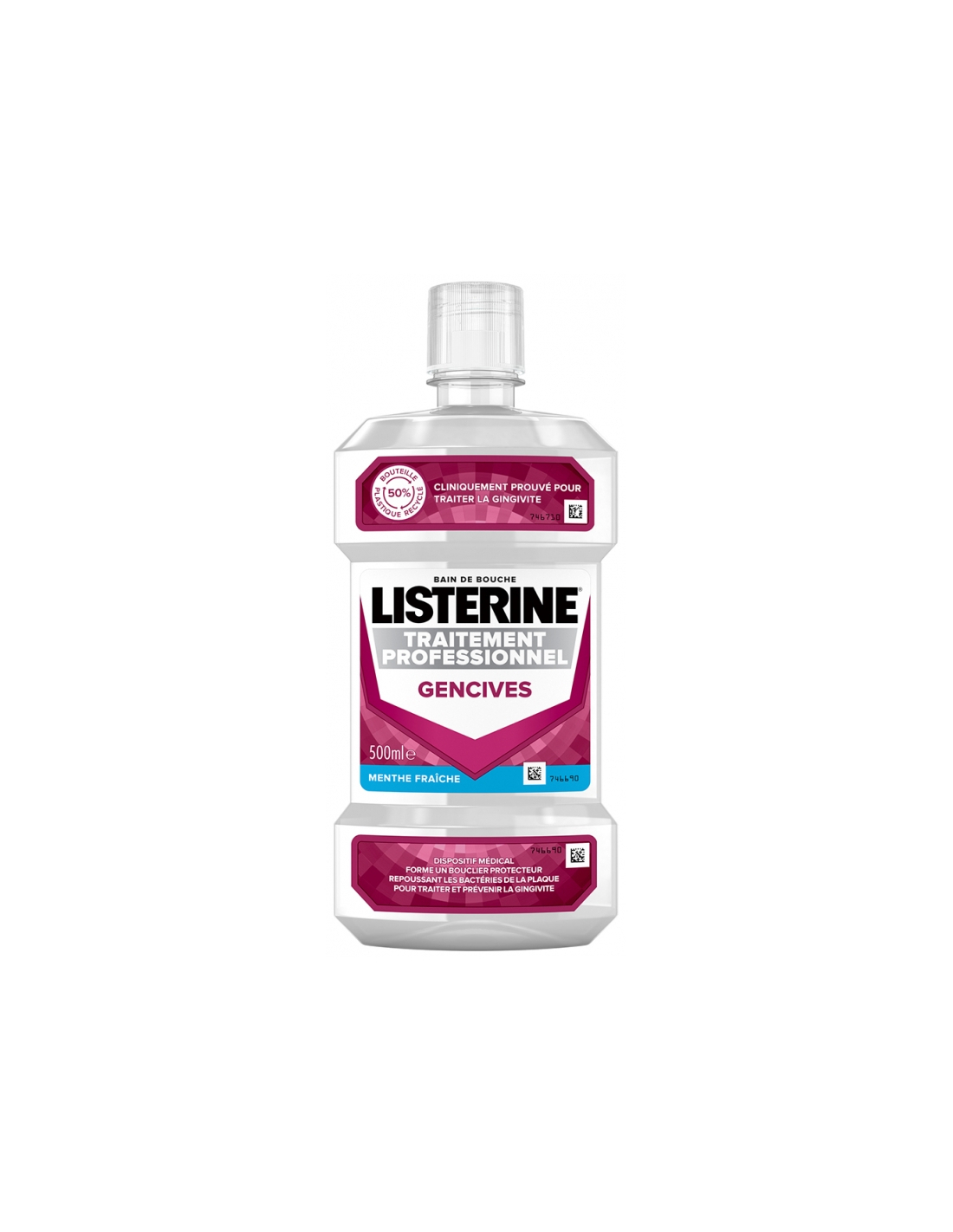 Listerine Traitement Professionnel Gencives 500 ml est un bain de bouche élaboré pour le traitement de la gingivite et une protection des gencives au quotidien. Il forme un bouclier protecteur, repoussant les bactéries de la plaque pour traiter et prévenir la gingivite. Dispositif médical. Goût Menthe fraîche.