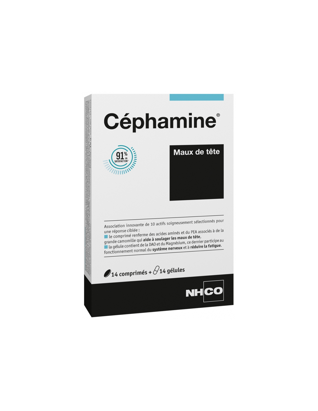 NHCO Céphamine 14 Comprimés + 14 Gélules est un complément alimentaire qui agit sur les maux de têtes. Les maux de tête peuvent être dus à des déséquilibres métaboliques internes. Des facteurs externes comme le stress, un choc émotionnel, un sommeil de mauvaise qualité ou encore une alimentation riche en histamine peuvent également déclencher ces douleurs. Elles peuvent être accompagnées de nausées et de vomissements. Ainsi, avoir une hygiène de vie adaptée peut s'avérer utile pour limiter l'apparition des maux de tête ainsi que leur intensité et leur durée.