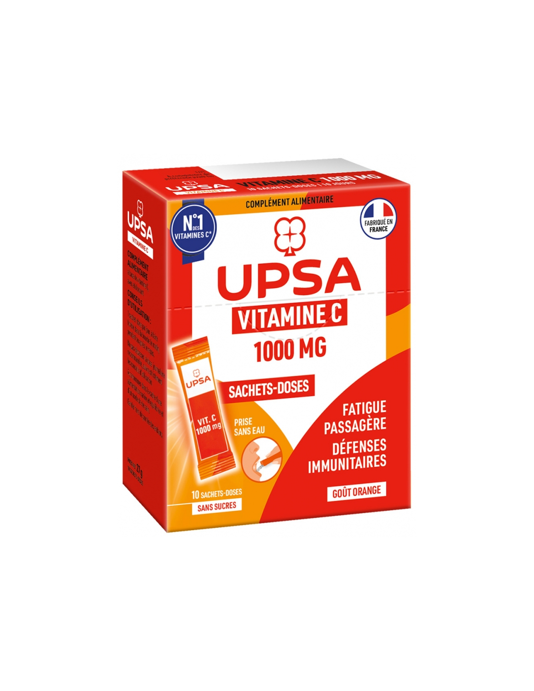 UPSA Vitalité Vitamine C 1000 mg 10 Sachets est un complément alimentaire à base de vitamine C qui contribue à un métabolisme énergétique normal, à réduire la fatigue et est également reconnue pour contribuer au fonctionnement normal du système immunitaire.